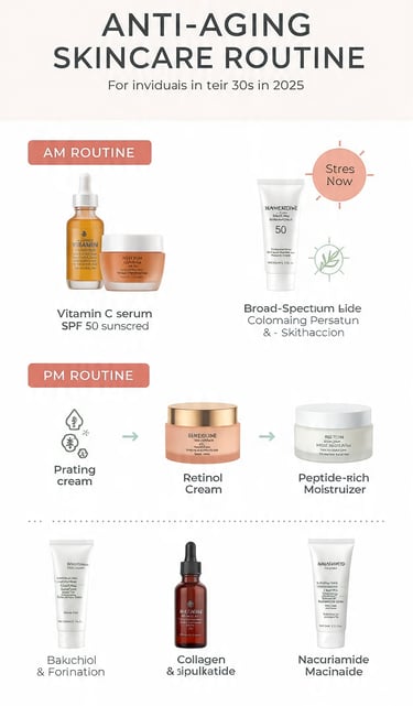Unlock anti-aging skincare routine for 30+ in 2025: AM vitamin C + SPF defense, PM retinol + peptides for wrinkle-free glow. Step-by-step with bakuchiol & niacinamide for collagen boost. Your 'anti-aging routine 30s' guide to timeless skin!